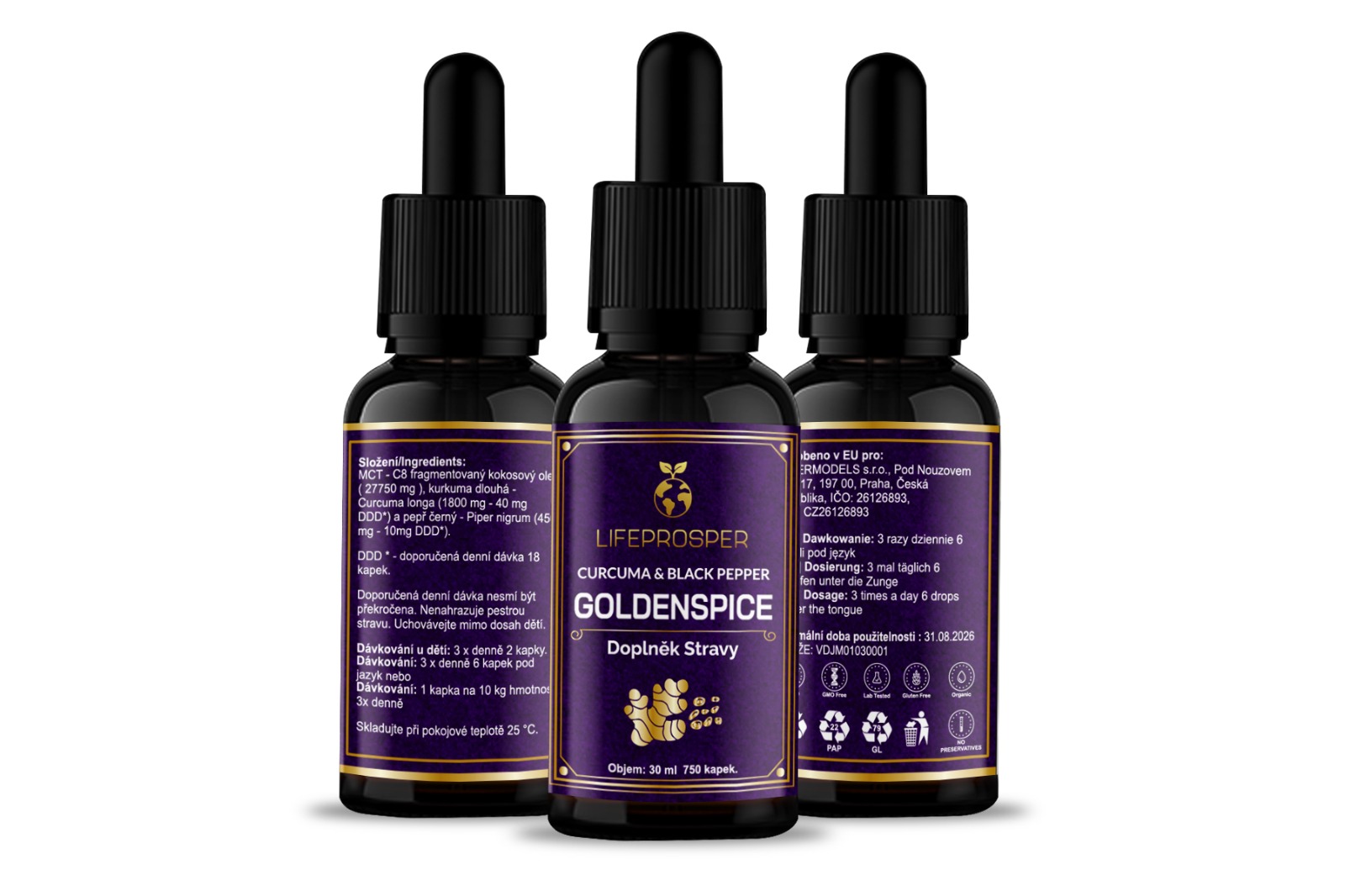 GOLDENSPICE is a premium blend of highly potent Curcumin (Curcuma longa) and Piperine (Piper nigrum), enriched with MCT C8 oil. Each dose provides 1800 mg of curcumin and 450 mg of piperine, ensuring maximum absorption and bioavailability due to the synergistic action of piperine. The inclusion of MCT C8 oil, known for its high caprylic acid content, further enhances the product's efficacy. GOLDENSPICE is unparalleled compared to other products on the market because it delivers the true power of extraction. It is a potent dietary supplement for those looking to support their overall health, manage weight, and boost vitality.